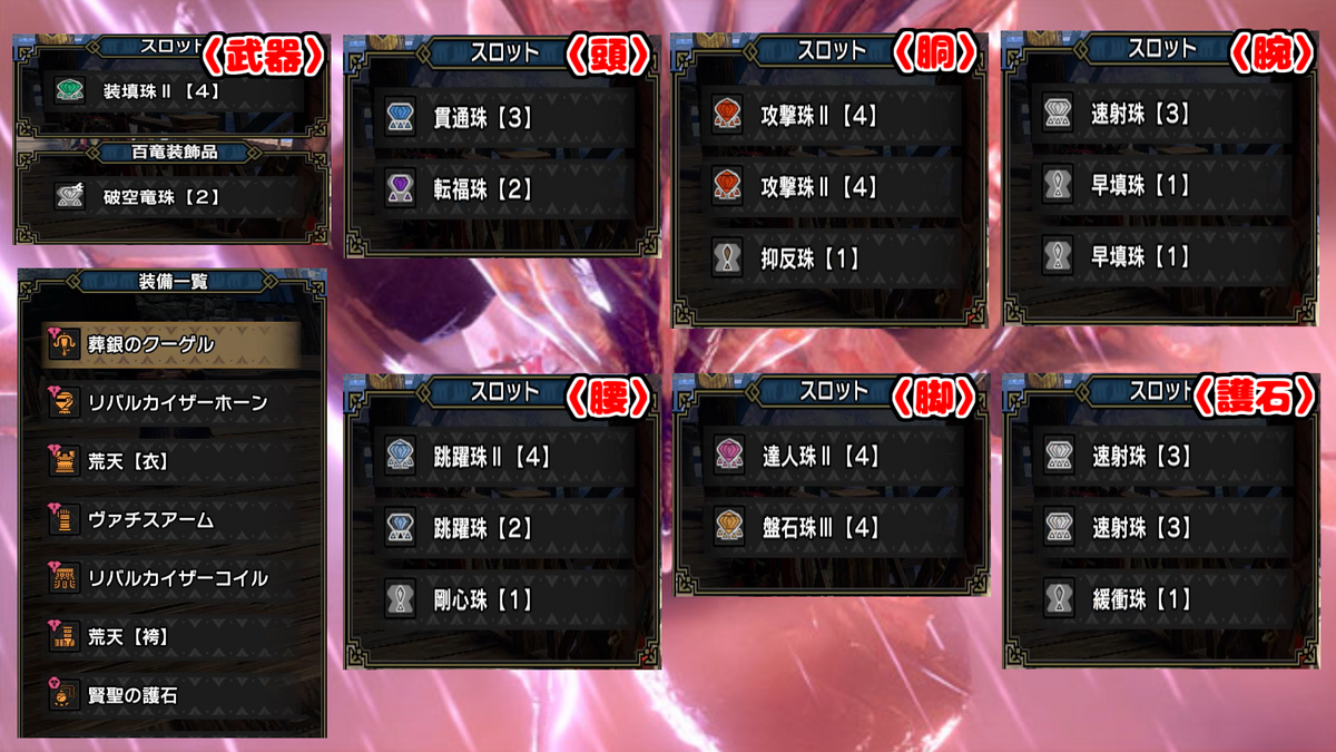 装飾品はこのような感じで、武器の百竜装飾品は狩るモンスターに合わせて特効系のものを入れ替えていただければと思います(傀異錬成で百竜スロット拡張)。