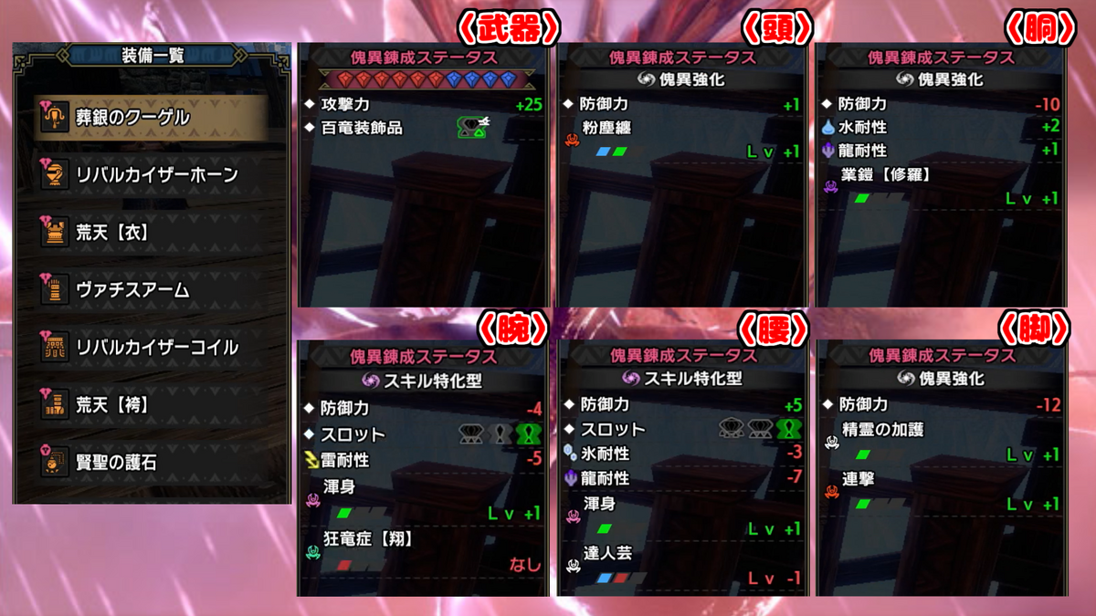 業鎧【修羅】Lv1×1部位、粉塵纏Lv1×1部位、それ以外は必要な2スロットスキル×1(可能ならプラスで1スロット)という感じで錬成しています。