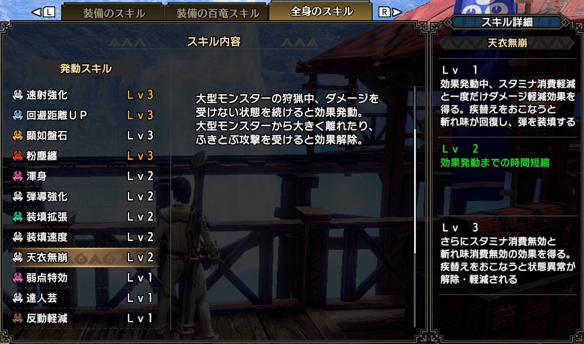 天衣無崩Lv1ですと60秒(剣士30秒、ガンナー60秒)被弾無しで発動、Lv2になるとこれが30秒(剣士15秒、ガンナー30秒)まで短縮できますので、発動のしやすさを考えてLv2までLvを上げています。