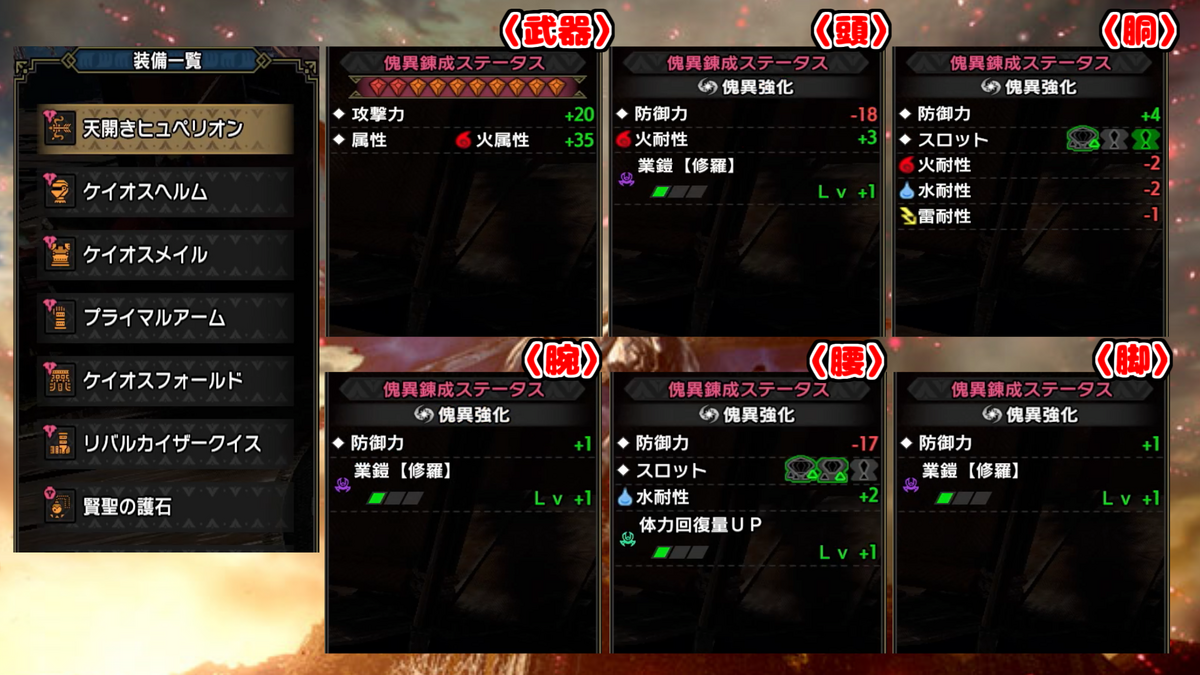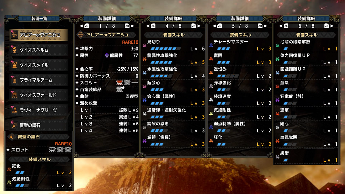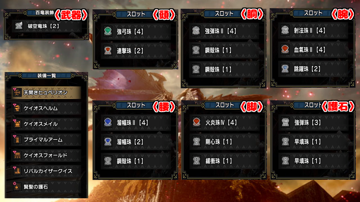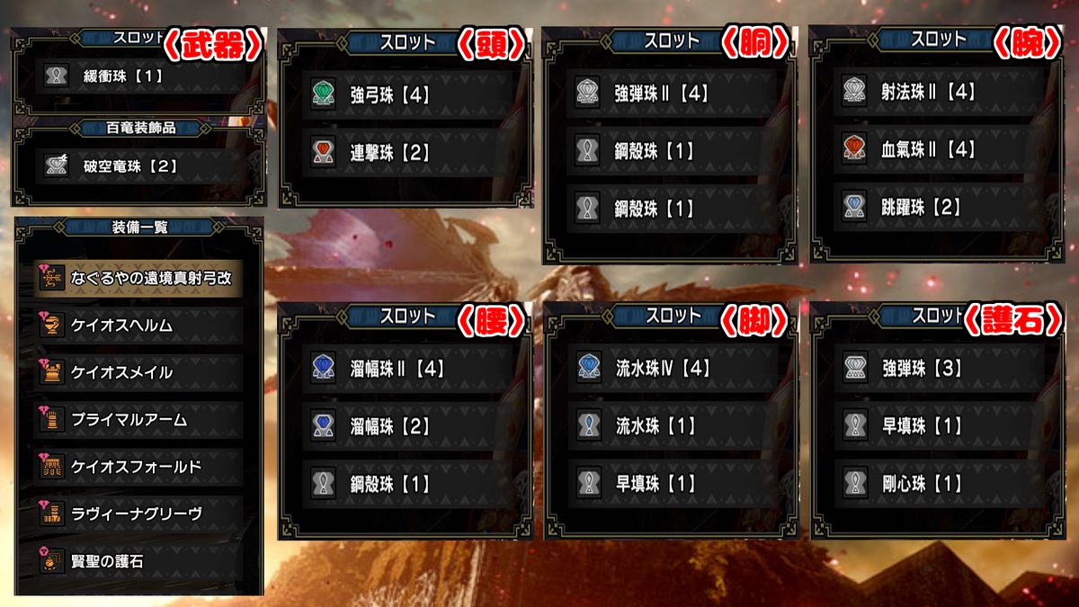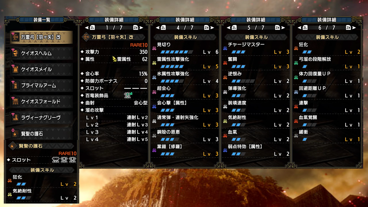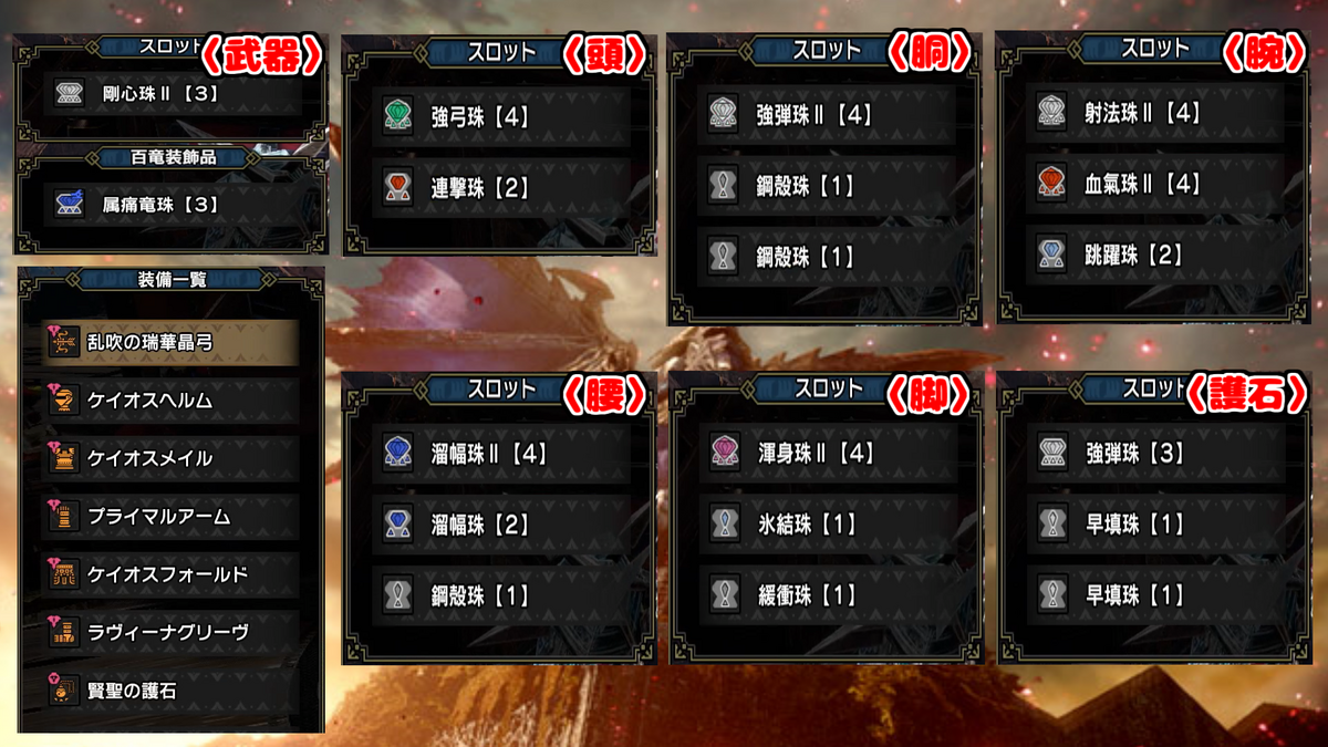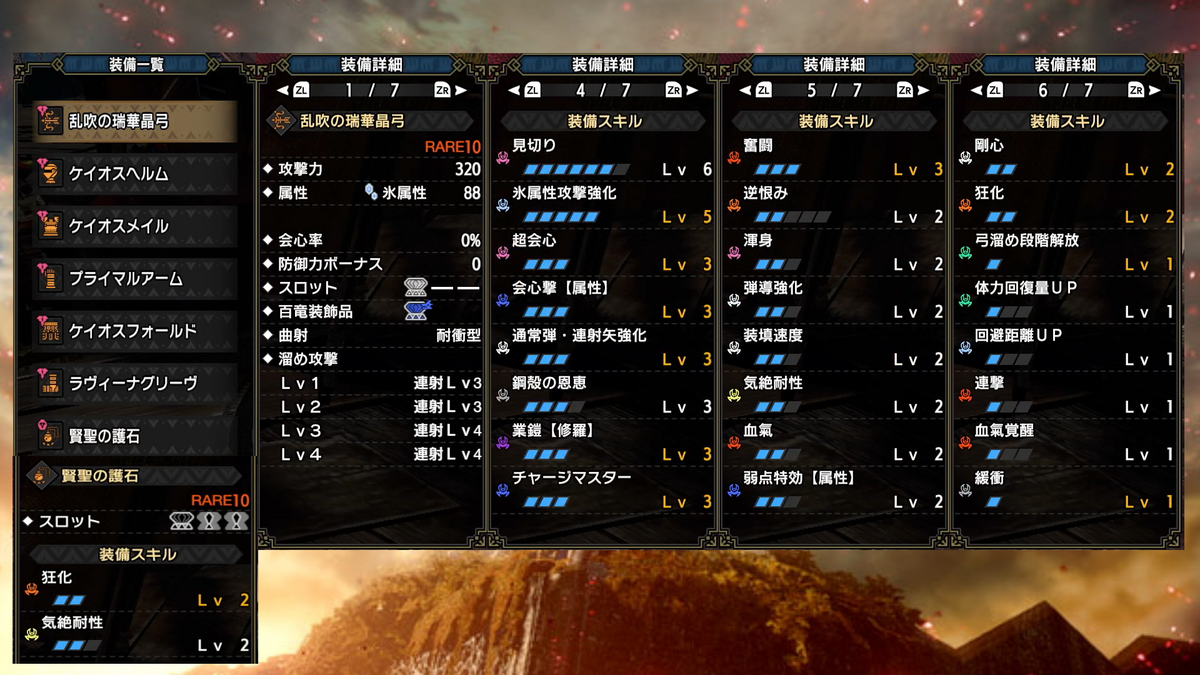 武器は各属性の連射弓、防具は、頭-混沌ゴア、胴-混沌ゴア、腕-原初メルゼナ、腰-混沌ゴア、脚-傀異克服テオ(火属性)、イヴェルカーナ(火属性以外)で、狂化スキルは護石で付与しております。